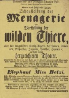 Zapowiedź przedstawień z udziałem tresowanych dzikich kotów: tygrysów bengalskich, lwów, jaguarów, panter, hien oraz numeru ze słonicą Panną Betzi, która obsługiwana jest przez małpkę przebraną za kelnera. Aby zachęcić widzów dodano, że lokal jest wygodnie urządzony z ogrzewaniem i oświetleniem gazowym. Druk wydał Ernst Litfass w Berlinie.
