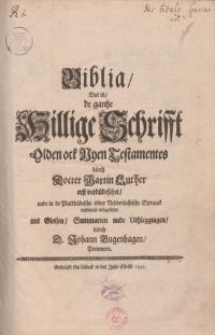 Biblia niemiecka wydana w Lubece w roku 1532 w przekładzie Marcina Lutra. Nakładcą był Ludwig Dietz, bibliofil, historyk i ekonomista pochodzący z Alzacji. Biblia zawiera drzeworytowe inicjały oraz liczne sceny biblijne. Na stronie przedtytułowej znajduje się dedykacja ofiarowania biblii przez Georga Bannehra, księgarza gdańskiego Bibliotece Gimnazjalnej w Elblągu.Prow. : 1. Georg Bannehr, 1736 [zapiska rękopiśmienna]2. Biblioteka Gimnazjalna w Elblągu [pieczęć]Oprawa : deska, skóra brązowa, tłoczenia ślepe, ozdobne klamry złocone, obcięcia kart barwione na niebiesko, w zwierciadle okładziny górnej scena przedstawiająca chrzest Chrystusa, w zwierciadle okładziny dolnej scena ukrzyżowania, XVI w.