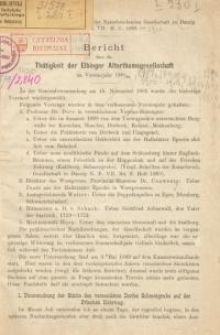 Nadbitka z : Schriften der Naturforschenden Gesellschaft zu Danzig, Bd. VII, H. 3. Sprawozdanie z działalności Elbląskiego Towarzystwa Starożytności za lata 1888/1889. 15 listopada 1888 roku na walnym zgromadzeniu wybrano ponownie dotychczasowy zarząd. W sprawozdaniu wymienione są wykłady, z których jeden poświęcony był Gottfriedowi Aschenwall - ojcu statystyki, pozostałe cztery poświęcone zagadnieniom archeologii. Dowiedzieć się też można o nowych badaniach i odkryciach, m.in. o zbadaniu cmentarzyska z epoki halsztadzkiej na południu od Elbląga.
