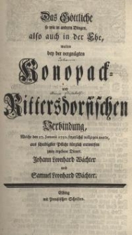 Druk okolicznościowy. Wiesz z okazji zaślubin Johann’a Konopack’a z Anną Elżbietą Rittersdorf. Uroczystość odbyła się 27 stycznia. Autorstwo wiersza - Johann Leonhard Wächter i Samuel Leonhard Wächter (Samuel – duchowny, urodzony w Malborku, pastor kościoła w Jeziorze, kaznodzieja ewangelicko-luterański we wsi Kaczynos. Zmarł w 1752 r.). Druk współoprawny z innymi drukami okolicznościowymi (klocek zawiera 106 druków).