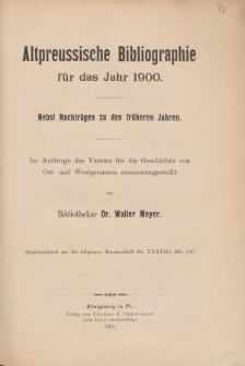 Bibliografia „staropruska”. Osiem razem oprawionych zeszytów – nadbitek z „Altpreußische Monatsschrift”, zawierających wykaz pozycji naukowych, które ukazały się w Prusach Wschodnich w latach 1896-1906. Bibliografia obejmuje pozycje książkowe, artykuły w czasopismach, biuletyny towarzystw naukowych etc. Publikacja na zlecenie Stowarzyszenia do Historii Prus Wschodnich i Zachodnich. Opracowanie – dr Walter Meyer (bibliotekarz). Zeszyty zostały oprawione przez elbląskiego introligatora Robert’a Bischoff’a (naklejka na wewnętrznej stronie okładki). Na stronach tytułowych poszczególnych zeszytów znak własnościowy - pieczątka F. Rühla.