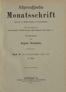 Miesięcznik o tematyce historyczno-krajoznawczej, wydawany przez filozofa i znawcę Kanta – Rudolfa Reicke (co tłumaczyć może mnogość artykułów poświęconych temu królewieckiemu filozofowi) oraz Ernsta Wicherta – prawnika i pisarza. Ukazywał się w latach 1864-1923. Początkowo (pierwsze cztery roczniki) ukazywał się pod rozszerzonym tytułem „Altpreußische Monatsschrift zur Spiegelung des provinziellen Lebens in Literatur, Kunst, Wissenschaft und Industrie“. Układ periodyku był następujący : rozprawy, następnie krytyki i referaty oraz na końcu kroniki i doniesienia. Najbardziej znaczący autorzy, publikujący w czasopiśmie to : Emil Steffenhagen, Max Töppen, Ernst Gottfried, Wilhelm Strehlke, Max Perlbach i inni. Biblioteka Elbląska w swoich zbiorach posiada roczniki 1864-1913 (niekompletne)