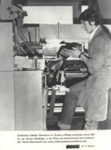 Autor zdjęcia : Dariusz Bocian, W : Miesięczna Kronika Fotograficzna : województwo elbląskie – listopad - 1979 r. (Nr 11/79). Gdańsk, Wydaw. : Krajowa Agencja Wydawnicza. Redaktor wydania U. Kaniewska. Na zdjęciu pracownik Marek Manuszewski przy nowej półautomatycznej ćwiekarce do pięt w Zakładach Obuwniczych im. Buczka w Elblągu. Zakład rocznie produkował 260 tys. par obuwia damskiego, w tym 90 tys. par przeznaczano na eksport.