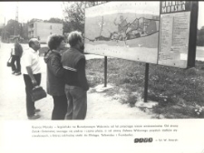 Autor zdjęcia : W. Amerski, W : Miesięczna Kronika Fotograficzna : województwo elbląskie – lipiec - 1979 r. (Nr 7/79). Gdańsk, Wydaw. : Krajowa Agencja Wydawnicza. Redaktor wydania : W. Amerski. Rozwój Łysicy (Krynicy Morskiej) rozpoczął się dopiero w 1840 roku, kiedy to pięciu zamożnych kupców elbląskich utworzyło konsorcjum do spraw żeglugi po Zalewie Wiślanym, a szczególnie do regularnej obsługi linii Królewiec - Elbląg. Rozwój jako kurortu morskiego rozpoczął się dopiero w 1905 roku. Wtedy to wybudowano duże molo, a następnie doprowadzono światło elektryczne i wodociąg. Powstały nowe pensjonaty i wille, usunięto parkan dzielący plażę. Znacznie zwiększyła się liczba chętnych do wypoczynku w tak uroczym miejscu. Po 1945 roku Łysica nie mogła odzyskać przez długi czas znaczącej pozycji wśród kąpielisk nadmorskich, traktowana jako osada rybacka. Dopiero w styczniu 1958 roku uzyskała prawa osiedlowe i zaistniała jako wczasowisko morskie, zmieniła też nazwę na Krynica Morska.Na zdjęciu : turyści przed planem Krynicy Morskiej ( w tle wznoszące się nowe ośrodki wczasowe).
