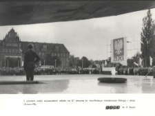 Autor zdjęcia : Dariusz Bocian, W : Miesięczna Kronika Fotograficzna : województwo elbląskie – wrzesień – 1979 r. (Nr 9/79). Gdańsk, Wydaw. : Krajowa Agencja Wydawnicza. Redaktor wydania : W. Amerski. Format : 28 x 21 cm.Zdjęcie prezentuje uroczystości pod Pomnikiem Odrodzenia w Elblągu z okazji 35-lecia PRL. Pomnik Odrodzenia na Placu Jedności Narodu (obecnie Plac Konstytucji) został odsłonięty w trzydziestą rocznicę PRL - 22.07.1975 roku. Ten monumentalny pomnik wykonany został z mosiężnej blachy w kształcie rozpostartego sztandaru, z wmontowanymi w niego licznymi reliefami ważnych i doniosłych wydarzeń historycznych i symbolami przypominającymi morskie tradycje Elbląga. Autorem był krakowski artysta-rzeźbiarz Jan Siek, a pomnik został wykonany przy wybitnym udziale elbląskiego „Zamechu” i jego pracowników. (Pomysłodawcą był I sekretarz KW PZPR Bolesław Smagała, a na pokrycie kosztów w Elblągu rozprowadzane były w Elblągu specjalne "cegiełki")