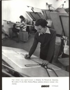 Autor zdjęcia : W. Amerski, W : Miesięczna Kronika Fotograficzna : województwo elbląskie –luty – 1979 r. (Nr 2/79). Gdańsk, Wydaw. : Krajowa Agencja Wydawnicza. Format : 21 x 28 cm.Na zdjęciu studenci IV roku Wydziału Budowy Maszyn elbląskiej filii Politechniki Gdańskiej, podczas zaliczania ćwiczeń z kreślarstwa w zimowej sesji egzaminacyjnej.