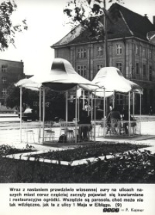 Autor zdjęcia : P. Kajmer, W : Miesięczna Kronika Fotograficzna : województwo elbląskie – czerwiec – 1978 r. (Nr 6/78). Gdańsk, Wydaw. : Krajowa Agencja Wydawnicza. Format: 18 x 24 cm. Na zdjęciu ogródek kawiarniany ustawiony przy ul. 1 Maja w Elblągu. Wraz z nadejściem wiosennej aury przed kawiarniami i restauracjami stawiane są tzw. parasolki. W pewnym sensie stanowią wizytówkę lokalu, atrakcyjnie bowiem reprezentują restaurację i przyciągają uwagę klientów.