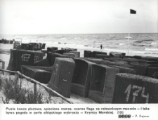 Fotoautor: P. Kajmer, in: Monatliche Photographische Chronik: Elbinger Woiwodschaft – Juli – 1978 (Nr. 7/78), Hrsg. Krajowa Agencja Wydawnicza, Format 24x18 cm. Das Foto zeigt den Strand in Kahlberg beim Unwetter (leere Strandkörbe, wenige Spaziergänger, stürmisches Meer und schwarze Flagge an dem Rettungsmast).