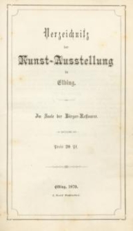 Wykaz 229 dzieł zgromadzonych na wystawie sztuki w Elblągu. Wystawa miała miejsce w Sali Resursy Mieszczańskiej w 1879 roku. 215 z wystawionych 229 dzieł to obrazy olejne, pozostałe wykonane w innych technikach.Książka współoprawna z innymi drukami (lata 1834-1883).