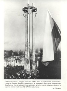 Autor zdjęcia : Z. Kosycarz, W: Miesięczna Kronika Fotograficzna : województwo elbląskie – styczeń – 1981 r. (Nr 1/81). Gdańsk, Wydaw.: Krajowa Agencja Wydawnicza. Format: 18 x 24 cm. Stoczniowcy zdążyli uczcić kolegów poległych w grudniu 1970 r. Na placu zbudowali potężny pomnik na planie koła, który składa się z trzech połączonych ramionami krzyży o wysokości 42 m i łącznej masie 126 ton. Do każdego przytwierdzona jest kotwica – symbol wiary i nadziei, kojarzący się jednocześnie z budową statków. W dolną część monumentu wkomponowano płaskorzeźby, które przedstawiają alegorie pracy stoczniowca, solidarności narodowej oraz starć społeczeństwa z reżimem. Towarzyszą im słowa Psalmu Dawidowego „Pan da siłę swojemu ludowi, Pan da swojemu ludowi błogosławieństwo pokoju” oraz fragment wiersza Czesława Miłosza. Na odsłonięcie pomnika 16 grudnia 1980 r. przyszło ćwierć miliona osób.