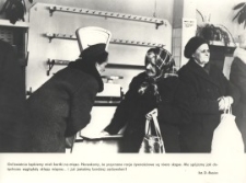Autor zdjęcia : D. Bocian, W: Miesięczna Kronika Fotograficzna : województwo elbląskie – marzec – 1981 r. (Nr 3/81). Gdańsk, Wydaw.: Krajowa Agencja Wydawnicza. Format: 24 x 18 cm. W kwietniu 1981 r, wprowadzono kartki na mięso. Społeczeństwo miało nadzieję, że system kartkowy pozwoli im choćby w minimalnym stopniu i bez upokarzającej walki w kolejkach wyżywić rodziny. Wprowadzenie kartek na mocy uchwały Rady Ministrów z 28 lutego 1981 r. było realizacją trzynastego postulatu porozumienia gdańskiego z sierpnia 1980 r. Normy kartkowe – to 3,5 kg, ale system karkowy rozszerzał się niemal na wszystkie towary, m.in. proszek, mydło, papierosy, czekolada, jedna półlitrówka na głowę dorosłej osoby etc.