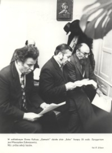 Autor zdjęcia : K. Urban, W: Miesięczna Kronika Fotograficzna : województwo elbląskie – marzec – 1981 r. (Nr 3/81). Gdańsk, Wydaw.: Krajowa Agencja Wydawnicza. Format: 18 x 24 cm. Związkowy Chór Męski "Echo” powstał 9 grudnia 1974 r. z inicjatywy animatora życia kulturalnego w Elblągu Jerzego Piekarskiego, który został pierwszym kierownikiem oraz dyrygentem. Nabór członków został przeprowadzony wśród pracowników ówczesnych Zakładów Mechanicznych „Zamech” im. gen. K. Świerczewskiego w Elblągu i liczył 39 osób. Pierwszy występ miał miejsce w Zamechowskim Domu Kultury „Zamech” 9 lutego 1975 r. Utworem inauguracyjnym była pieśń „Na Grunwaldzkiem Polu”. Repertuar chóru to m.in. muzyka dawna, religijna oraz muzyka ludowa. Na zdjęciu jedna z prób sekcji basów, gdzie dyrygentem był Mieczysław Zakwasowicz.