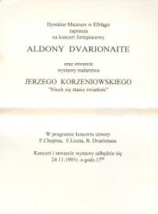 Muzeum w Elblągu zaprasza 24.11.1995 r. na otwarcie wystawy malarstwa Jerzego Korzeniowskiego „Niech się stanie światłość” oraz na koncert fortepianowy Aldony Dvarionaite. W programie koncertu utwory Chopina, Liszta i Dvarionasa.