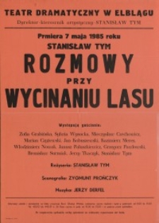 Autorski spektakl Stanisława Tyma „Rozmowy przy wycinaniu lasu” został zaprezentowany elbląskiej publiczności 7.05.1985 r. Opowieść o drwalach, których głównym zajęciem jest czekanie na pracę, które to czekanie umilają sobie różnymi opowieściami. Oczami leśnych robotników tropi dramaturg absurdy życia społecznego, w krzywym zwierciadle satyry ukazuje ogłupiającą cywilizację, odsłania aspekty rzeczywistości, broni podstawowych wartości moralnych. Na zdjęciu afisz zwiastujący spektakl w Teatrze Dramatycznym w Elblągu, z Janem Kobuszewskim w roli głównej.