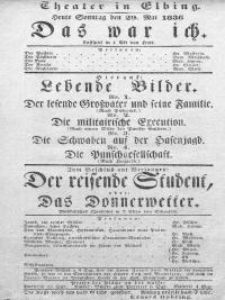Afisz teatralny jednoaktowej komedii: „To byłem ja”, żywych obrazów pt. „ Czytający dziadek i jego rodzina”, „Egzekucja wojskowa”, „Szwabowie polujący na zające”, „Towarzystwo przy ponczu” oraz przedstawienia zagranego na żądanie publiczności: „Podróżujący student, czyli burza” wystawionych 29 maja 1836 roku.