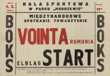 W dawnej hali sportowej w parku "Modrzewie" w Elblągu w dniu 05.10.1975 r. odbyło się międzynarodowe spotkanie towarzyskie klubów pięściarskich "Vointa" z Rumunii i "Start" Elbląg. Na zdjęciu afisz z tego spotkania.