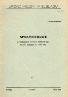 Urząd Miejski w Elblągu wydał w 1979 r. biuletyn dotyczący wykonania budżetu terenowego miasta Elbląga za 1978 r. Sprawozdanie podzielono na kilka części : I. Ogólne wykonanie budżetu, w którym stwierdzono, że budżet zrealizowano z dużą nadwyżką w związku z osiągnięciem dochodów ponadplanowych oraz niewykorzystanych w pełnej wysokości zaplanowanych wydatków. Zgodnie z artykułem 13 ustawy budżetowej na rok 1979 - Dz.U. Nr 30 poz.129 z dnia 21 grudnia 1978 roku największą część osiągniętej nadwyżki władze miejskie przekazały do budżetu centralnego, część na fundusz zasobowy Miejskiej Rady Narodowej(MRN) a część na zwiększenie rezerwy budżetowej. Dział II. Dochody własne - z budownictwa, gospodarki komunalnej, gospodarki mieszkaniowej, ten budżet ze względu na dochody ze sprzedaży dokumentacji projektowo-kosztorysowej Miejskiego Zespołu Usług Projektowych oraz wpływy z podatku od nieruchomości gospodarki uspołecznionej także zrealizowano z nadwyżką. Największą pozycją w tej części okazały się wpływy z gospodarki nie uspołecznionej i od ludności. Działy III. Dotacje wyrównawcze, IV. Zaangażowana rezerwa budżetowa, VI. Kapitalne remonty oraz VII. Inwestycje uzyskały 100 % zakładanego planu. Dział V. Wydatki bieżące - zrealizowano w 99,7 % w tym dziale wykonywano wydatki m. in. na szkolnictwo, kulturę i sztukę, kulturę fizyczną i turystykę oraz świadczenia społeczne. W biuletynie znajduje się tabela podsumowująca wykonanie budżetu oraz trzy stronicowa informacja o dokonanych zmianach w budżecie miasta Elbląga.