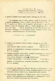 Urząd Miejski w Elblągu wydał w 1980 r. druk - Uchwała Nr ... Miejskiej Rady Narodowej w Elblągu z dnia ... 1980 r. w sprawie budżetu terenowego miasta Elbląga na rok 1980. W materiale m. in. uchwalono dochody budżetu miasta Elbląga na rok 1980, uchwalono dochody zakładów budżetowych, środków specjalnych i funduszów celowych budżetu miasta. Upoważniono Prezydenta Miasta do dokonywania przeniesień kredytów między działami budżetu po zasięgnięciu opinii właściwej komisji Miejskiej Rady Narodowej oraz dysponowaniem rezerwą budżetową na nieprzewidziane wydatki. O zmianach tych Prezydent zobowiązany jest do składania informacji na najbliższej sesji Miejskiej Rady Narodowej za pierwsze półrocze, za drugie razem ze sprawozdaniem z wykonania budżetu. Na stronach Biblioteki Elbląskiej opublikowano jeszcze kilka dokumentów z różnych lat, dotyczących uchwał MRN w sprawie budżetu terenowego miasta Elbląga za rok 1979, 1982 czy za 1983.