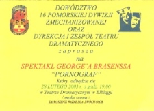 Teatr Dramatyczny w Elblągu zaprezentował 28.02.2003 r. na Małej Scenie sztukę George’a Brasenssa „Pornograf”. Na zdjęciu zaproszenie wystawione przez Dowództwo 16 Pomorskiej Dywizji Zmechanizowanej oraz Dyrekcję i Zespół Teatru Dramatycznego w Elblągu.