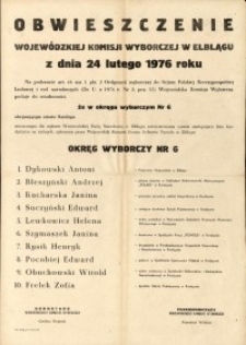 | 1976, Obwieszczenie Wojewódzkiej Komisji Wyborczej w Elblągu 1976 r. - okręg wyborczy nr 6 - afisz | Feb 17, 2017 |