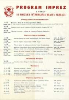 Title: Program Imprez z Okazji Trzydziestej Trzeciej Rocznicy Wyzwolenia Miasta Elbląga - afisz
