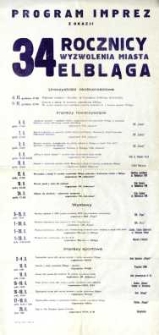 Organizatorzy obchodów 34-ej rocznicy wyzwolenia miasta Elbląga wydali afisz z programem imprez towarzyszących. Przygotowano wiele różnego rodzaju imprez trwających od 1.02 do 25.02.1979 roku. Jak co roku składano wieńce i kwiaty na cmentarzu żołnierzy radzieckich. W programie z 1979 roku zabrakło składania wieńców i kwiatów pod Pomnikiem Odrodzenia ale jak dawniej odbył się uroczysty koncert w którym wystąpiły lokalne zespoły artystyczne. Aktywnie w obchodach uczestniczył Zakładowy Dom Kultury "Zamech" m.in. dzięki niemu spotkały się dzieci z najstarszymi nauczycielami, odbył się również koncert kameralny Zespołu Kameralnego Filharmonii Bałtyckiej, był współorganizatorem z Muzeum w Elblągu wystawy "Kształtowanie się władzy ludowej w Elblągu w latach 1945-1947". Kilka wystaw stało się udziałem Spółdzielczego Domu Kultury "Pegaz" - wystawy plakatów i fotografii. Spotkania typu kameralnego przygotowała Spółdzielnia Mieszkaniowa "Zakrzewo". Dla bardziej aktywnych odbiorców przygotowano atrakcje sportowe - turnieje o puchary wyzwolenia Elbląga a dla chętnych Oddział Miejscowy PTTK umożliwił uczestnictwo w "Rajdzie im. Kpt. Diaczenki" w dwóch wersjach pieszej i kolarskiej po lasach komunalnych Bażantarnia. Format tego afisza w stosunku do tego z roku 1978 czy z roku 1977 jest nietypowy - bardzo długi.