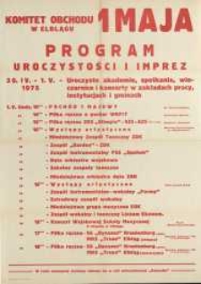 Komitet obchodów Święta 1 Maja w Elblągu przygotował program imprez uświetniających rocznicę Święta Pracy. Uroczystości trwały od 30.04 do 01.05. 1975 r. Wprawdzie oficjalne uroczyste akademie, spotkania, modne wieczernice i koncerty w zakładach pracy, instytucjach i gminach odbyły się pierwszego dnia uroczystości. To istotą obchodów pozostawał zorganizowany pochód 1-szo Majowy o godz. 10 dnia następnego 1.05.1975 r. prowadzący ulicą Aleja Grunwaldzka. Większość przygotowanych imprez w tym roku miała charakter artystyczny i kulturalny a w mniejszym stopniu sportowy. M. in. w muszli koncertowej w lasach komunalnych "Bażantarnia" odbyły się występy Młodzieżowego Zespołu Tanecznego, Zespołu "Bardon" i Młodzieżowej Orkiestry Dętej wszystkie z ZDK (Zakładowy Dom Kultury "Zamech"). W tym samym czasie na Placu Jagiellończyka odbywały się występy Zespołu instrumentalno-wokalnego "Formy" czy Młodzieżowej grupy muzycznej z EOK-u (Elbląski Ośrodek Kultury) i innych. Sportowym wydarzeniem tego dnia, były mecze w piłce ręcznej chłopców i dziewcząt, rozegrane na boisku szkolnym przy Technikum Mechanicznym na ulicy Komeńskiego. Pomiędzy zespołami SG "Dynamo" Oranienburg z byłej Niemieckiej Republiki Demokratycznej a MKS "Truso". Organizatorzy zaznaczyli na plakacie, iż w razie niepogody występy odbędą się w sali widowiskowej "Zamech" mieszczącej się wówczas przy ulicy Fabrycznej.