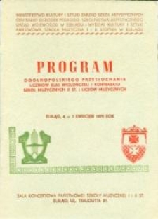 Ministerstwo Kultury i Sztuki, Zarząd Szkół Artystycznych, Centralny Ośrodek Pedagogiczny Szkolnictwa Artystycznego, Wydział Kultury i Sztuki Urzędu Wojewódzkiego w Elblągu, Państwowa Szkoła Muzyczna I i II Stopnia w Elblągu zorganizowały - Ogólnopolskie przesłuchania uczniów klas wiolonczeli i kontrabasu szkół muzycznych stopnia drugiego i Liceów Muzycznych. Odsłuchania odbyły się w Elblągu w sali koncertowej Państwowej Szkoły Muzycznej w dniach od 4.04 do 7.04.1979 r. wedle ustalonego wcześniej i wydrukowanego programu. Dokument zawierał spis rzeczoznawcówtego odsłuchania w formie zebranych - przewodniczącego komisji, członków komisji, sekretarzy, prelegentów przesłuchań. Następnie opisane zostały poszczególne dni przesłuchań - godziny wystąpień, koncert inauguracyjny przesłuchań, rodzaj instrumentu, dane uczestnika, tytuły granych utworów, dane prowadzącego ucznia i dane akompaniującego oraz kiedy nastąpiła przerwa. W sobotę 7.04.1979 r. przewidziano w sali koncertowej ogłoszenie wyników i programu koncertu laureatów. Potem miało nastąpić wręczenie dyplomów szkołom i uczniom. Jeszcze później zaplanowano wręczenie dyplomów i nagród wyróżnionym uczestnikom oraz Koncert Laureatów. Broszura będąca w posiadaniu Biblioteki Elbląskiej ma powykreślane długopisem dane uczestników i koncertów ale dołączone są na papierze bardzo słabej jakości pisane maszyną do pisania dane uczestników i koncertów nowych. Dokumentów poświęconych końcowym przesłuchaniom uczniów szkół muzycznych jest więcej, aby je odszukać wpisujemy do Wortala Biblioteki Elbląskiej słowa - "Ogólnopolskie Przesłuchania".