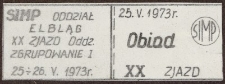 W dniach 25-26.05.1973 r. Stowarzyszenie Inżynierów i Techników Mechaników Polskich (SIMP) Oddział w Elblągu zorganizował XX Zjazd SIMP w Elblągu (zgrupowanie 1). Na zdjęciu kupon obiadowy na dzień 25.05.1973 r.SIMP - Organizacja użyteczności społecznej powstała w Polsce w 1928 r. i zrzeszała inżynierów i techników mechaników wszystkich specjalności oraz zawodów pokrewnych. Celem SIMP było krzewienie nauki i techniki, podnoszenie kwalifikacji zawodowych członków etc. „SIMP” na ziemi elbląskiej funkcjonował od 1948 r. (w niektórych materiałach odnotowano powstanie w 1946 roku przy Fabryce Wyrobów Metalowych „blaszance”). Zakładem w którym rozwinięto działalność SIMP była ówczesna „Stocznia Nr 16 (późniejszy ”Zamech”, zatrudniająca w 1947 roku 3 inżynierów i 17 techników). W 1948 roku SIMP zorganizował pierwszy „Wieczór Karnawałowy”, z którego dochód przeznaczono na odbudowę Domu Technika Naczelnej Organizacji Technicznej w Elblągu. Być może powyższy fakt zaważył na przyjęciu roku 1948 jako początku działalności SIMP na Ziemi Elbląskiej. W Elblągu Oddział SIMP z siedzibą na terenie „Zamechu” powstał w 1954 roku, obejmując swoim zakresem działania tylko koła tego zakładu. Równocześnie na terenie Elbląga działały koła podległe zarządowi oddziału wojewódzkiego w Gdańsku.