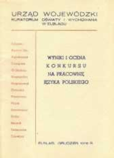 Kuratorium Oświaty i Wychowania Urzędu Wojewódzkiego w Elblągu wydało sprawozdanie w formie broszury z konkursu na pracownię języka polskiego. Dokument zawiera m.in.: wypowiedź wicekuratora Józefa Klimka, zasady oceny komisji konkursu, opis stanu wyposażenia pracowni polonistycznych, wybrane pozycje bibliograficzne dotyczące organizowania warsztatu polonistycznego oraz liczne zdjęcia (zła jakość) przedstawiające kąciki (pracownie) polonistyczne na terenie szkół woj. elbląskiego.