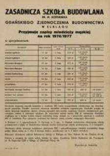 Tytuł: Zasadnicza Szkoła Budowlana w Elblągu ogłasza nabór na rok szkolny 1976/1977 - afisz