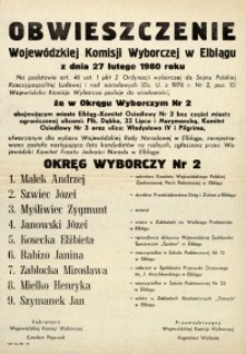 | 1980, Obwieszczenie Wojewódzkiej Komisji Wyborczej w Elblągu 1980 r. - okręg wyborczy nr 2 - afisz | Oct 25, 2013 |