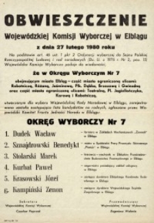 | 1980, Obwieszczenie Wojewódzkiej Komisji Wyborczej w Elblągu 1980 r. - okręg wyborczy nr 7 - afisz | Oct 25, 2013 |