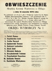 Title: Obwieszczenie Miejskiej Komisji Wyborczej w Elblągu 1978 r. - okręg wyborczy nr 1 - afisz