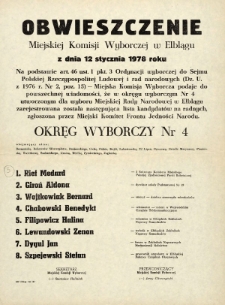 | 1978, Obwieszczenie Miejskiej Komisji Wyborczej w Elblągu 1978 r. - okręg wyborczy nr 4 - afisz | Jan 8, 2019 |