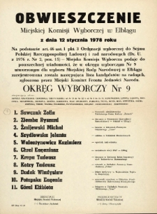 Tytuł: Obwieszczenie Miejskiej Komisji Wyborczej w Elblągu 1978 r. - okręg wyborczy nr 9 - afisz