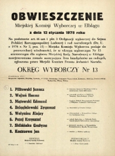 | 1978, Obwieszczenie Miejskiej Komisji Wyborczej w Elblągu 1978 r. - okręg wyborczy nr 13 - afisz | Jan 8, 2019 |