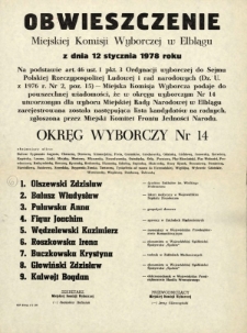 | 1978, Obwieszczenie Miejskiej Komisji Wyborczej w Elblągu 1978 r. - okręg wyborczy nr 14 - afisz | 8 sty 2019 |