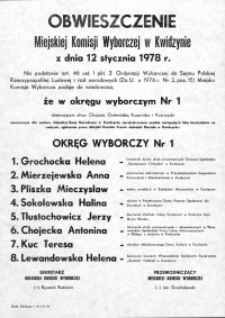 Tytuł: Obwieszczenie Miejskiej Komisji Wyborczej w Kwidzynie 1978 r. - okręg wyborczy nr 1 - afisz
