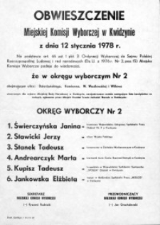 | 1978, Obwieszczenie Miejskiej Komisji Wyborczej w Kwidzynie 1978 r. - okręg wyborczy nr 2 - afisz | 11 paź 2018 |
