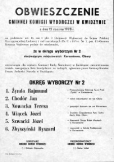 Tytuł: Obwieszczenie Gminnej Komisji Wyborczej w Kwidzynie 1978 r. - okręg wyborczy nr 2 - afisz