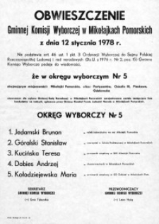 | 1978, Obwieszczenie Gminnej Komisji Wyborczej w Mikołajkach Pomorskich 1978 r. - okręg wyborczy nr 5 - afisz | 11 paź 2018 |