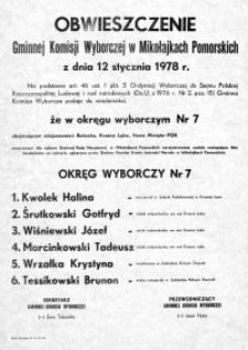 Tytuł: Obwieszczenie Gminnej Komisji Wyborczej w Mikołajkach Pomorskich 1978 r. - okręg wyborczy nr 7 - afisz