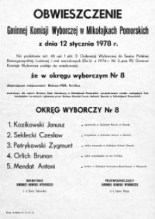 | 1978, Obwieszczenie Gminnej Komisji Wyborczej w Mikołajkach Pomorskich 1978 r. - okręg wyborczy nr 8 - afisz | Oct 11, 2018 |