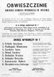 | 1978, Obwieszczenie Gminnej Komisji Wyborczej w Ryjewie 1978 r. - okręg wyborczy nr 7 - afisz | 11 paź 2018 |