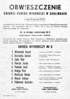 | 1978, Obwieszczenie Gminnej Komisji Wyborczej w Sadlinkach 1978 r. - okręg wyborczy nr 2 - afisz | 11 paź 2018 |