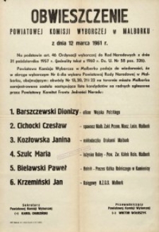 | 1961, Obwieszczenie Powiatowej Komisji Wyborczej w Malborku 1961 r. - lista kandydatów okręgu wyborczy nr 6 - afisz | 11 paź 2018 |