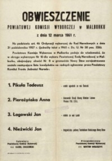 | 1961, Obwieszczenie Powiatowej Komisji Wyborczej w Malborku 1961 r. - lista kandydatów okręgu wyborczy nr 10 - afisz | 11 paź 2018 |