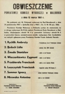 Tytuł: Obwieszczenie Powiatowej Komisji Wyborczej w Malborku 1961 r. - lista kandydatów okręgu wyborczy nr 12 - afisz