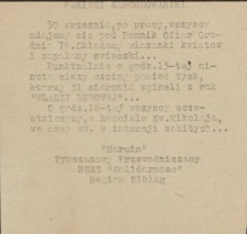 Tymczasowy Przewodniczący NSZZ „Solidarność” Edmund Krasowski (pseud. „Marcin”) wystosował apel do mieszkańców o stawiennictwo 30 września pod Pomnikiem Ofiar Grudnia 1970. W programie spotkania przewidziano składanie wiązanek i kwiatów oraz mszę w kościele św. Mikołaja w Elblągu. Prezentowany dokument pochodzi z archiwów przekazanych w darze Bibliotece Elbląskiej przez NSZZ „Solidarność” Elbląg.
